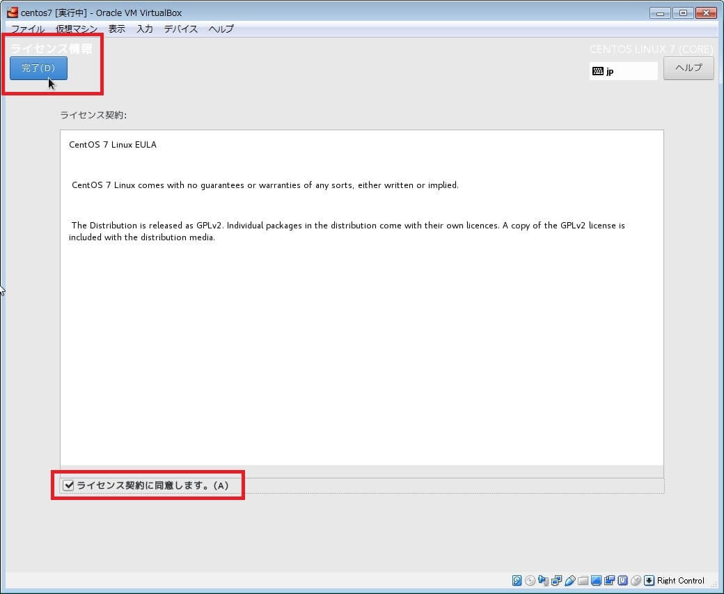 [ライセンス情報]画面が表示されるので、[ライセンス契約に同意します。]をオンにして[完了]をクリックします。