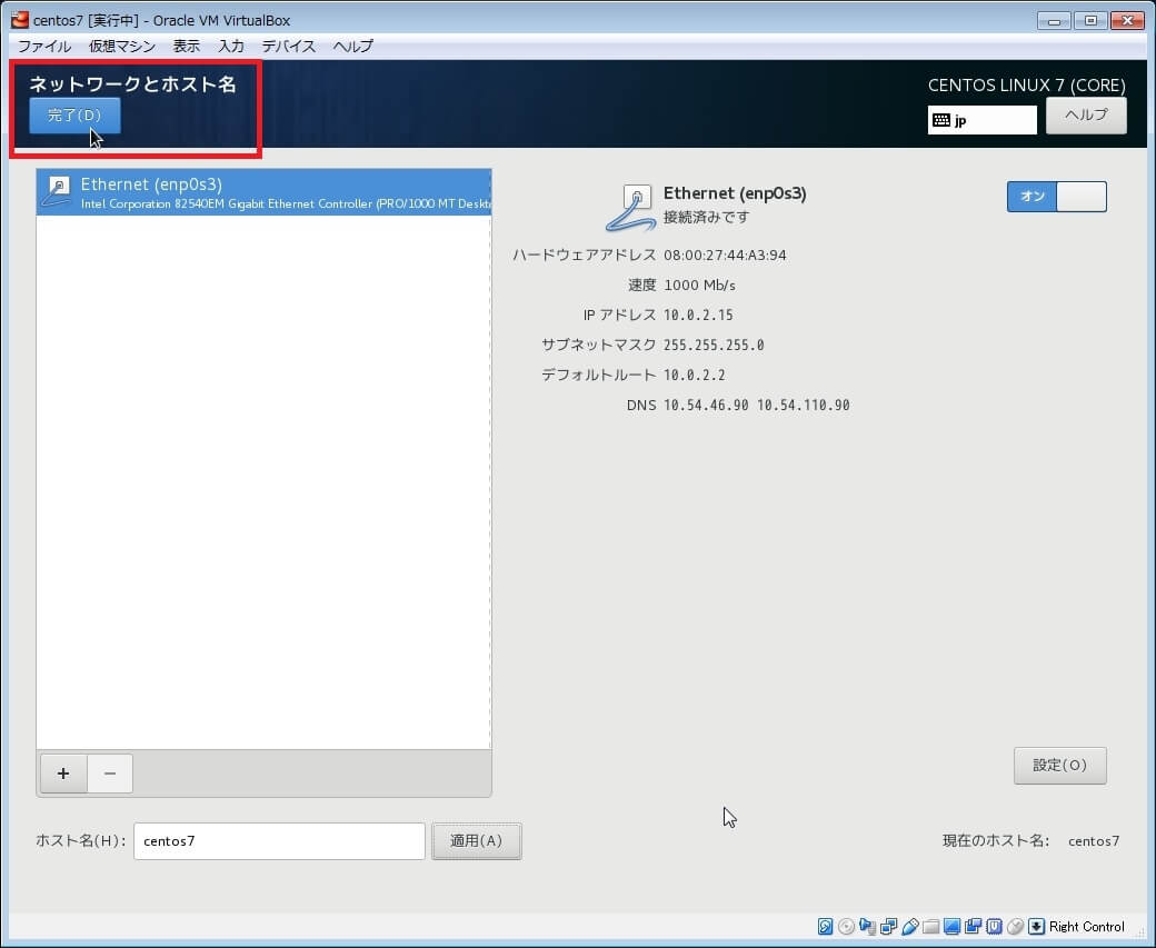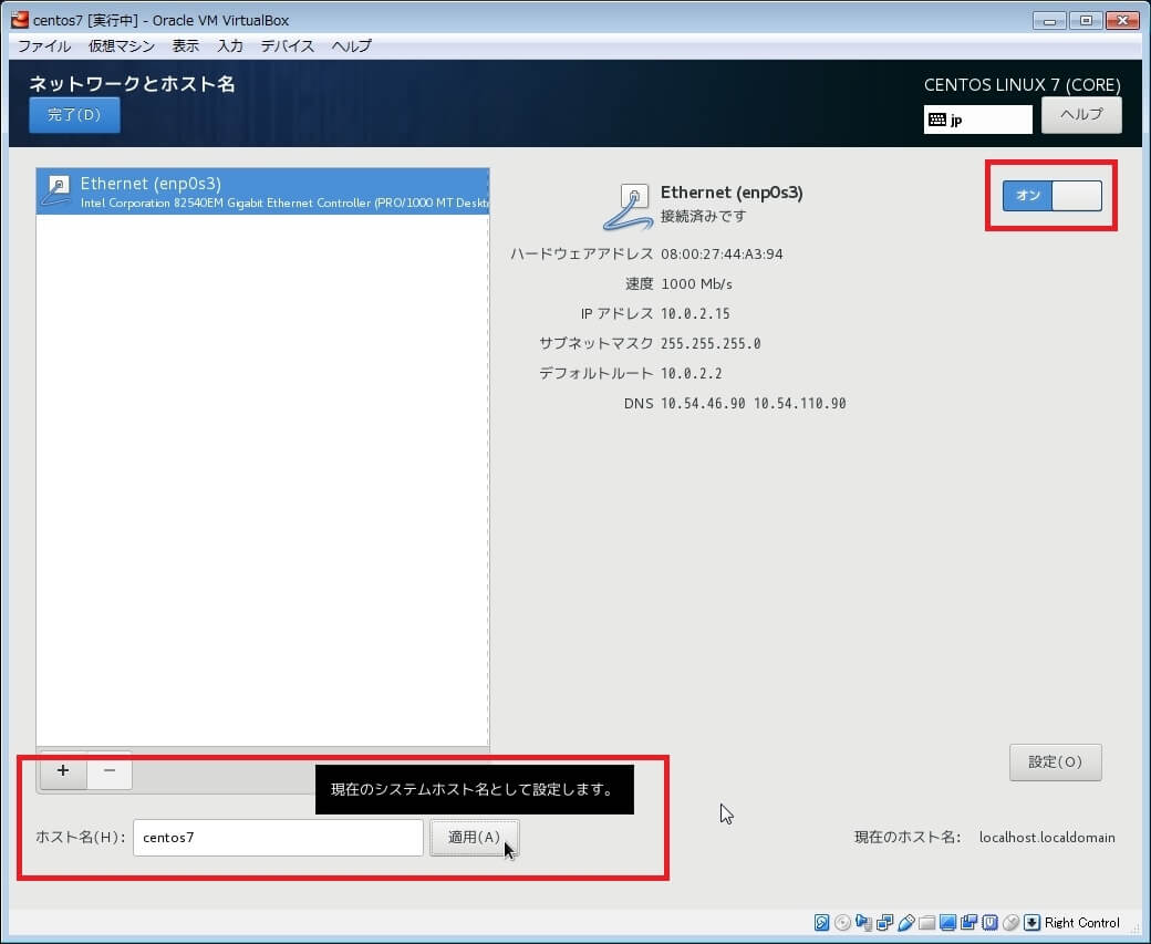 [ネットワークとホスト名]画面が表示されるので、[Ethernet]をオンに変更し、[ホスト名]ボックスに任意のホスト名(ここではcentos7に設定)を入力し、[適用]をクリックします。
