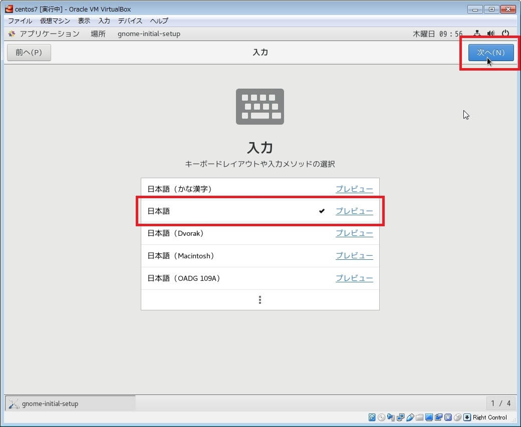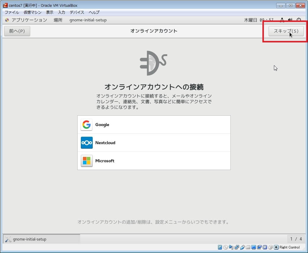 CentOSにログイン後、自動で[gnome-initial-setup]が起動しますので以下の手順に沿って設定を行ってください。