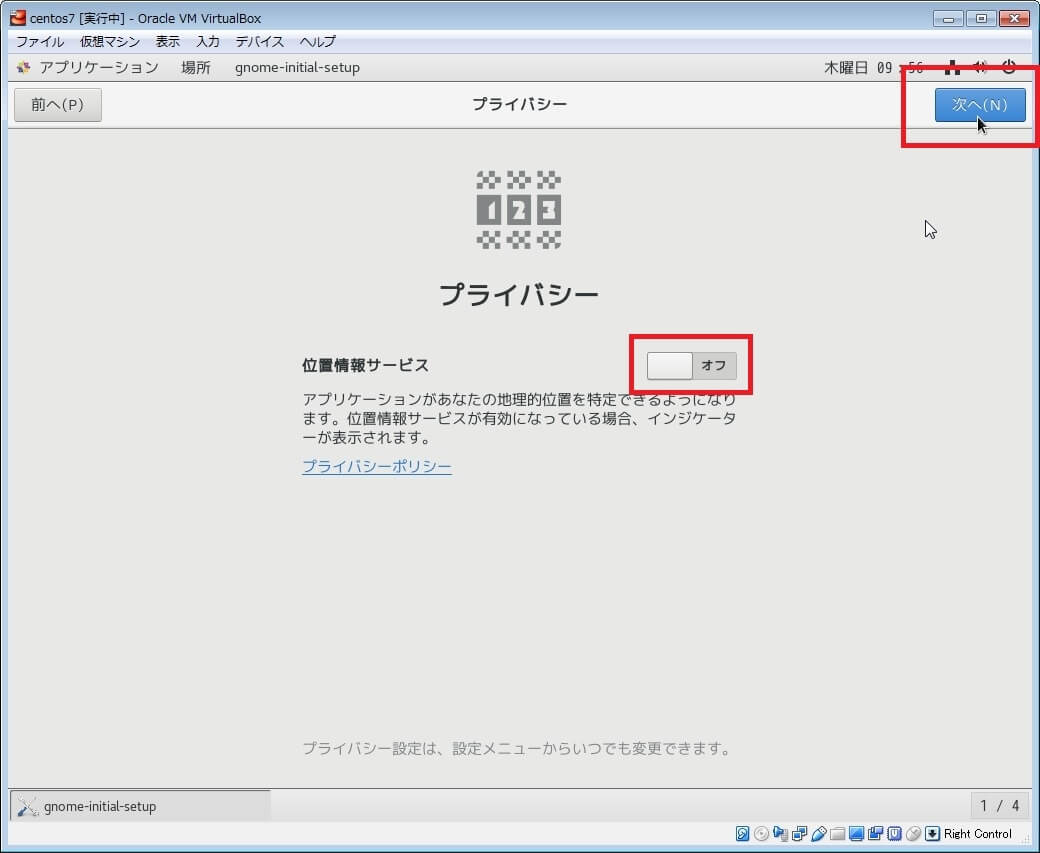 [プライバシー]画面が表示されるので、”位置情報サービス”を任意の設定(基本オフ)にして[次へ]をクリックします。