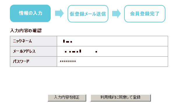 入力内容の確認画面が表示されるので、間違いがなければ、[利用規約に同意して登録]をクリックする。