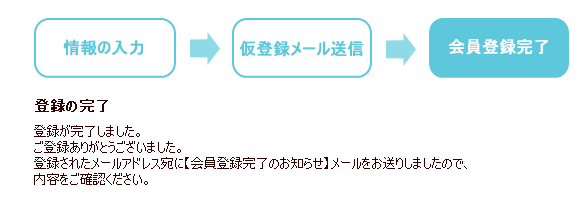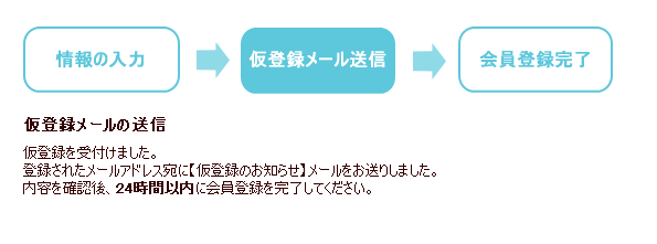 仮登録メールの送信画面が表示されるので、登録時に入力したメールアドレスのメールをチェックする。