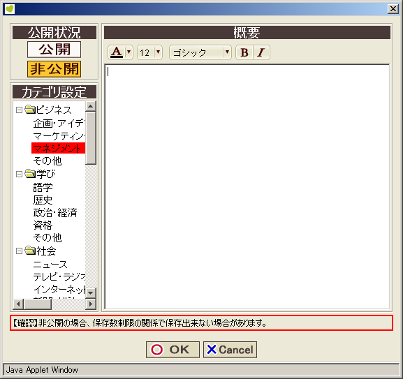 保存する際に公開/非公開、カテゴリの指定ができる。