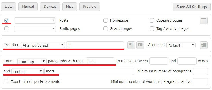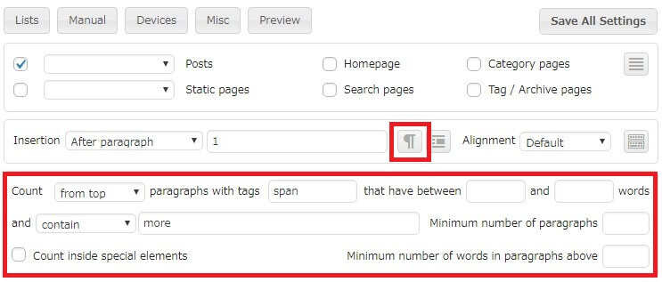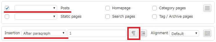 まず[Posts]のチェックをオンにし、[Insertion]のドロップダウンリストから"After paragraph"を選択します。