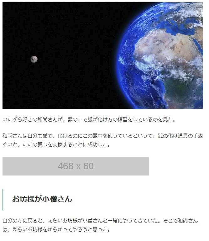 通常「Ad Inserter」を使って概要の下に広告を表示したい場合は、記事本文の最初の段落(H2とかH3タグが設定されている)の前に広告を表示する設定を行います。