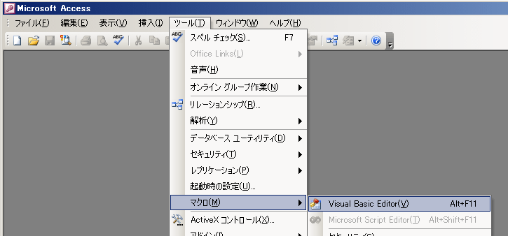 [ツール]メニューをクリックし、[マクロ]をポイントし、[Visual Basic Editor]をクリックする。