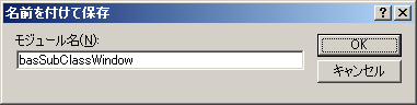 この際以下のような標準モジュール名を入力する[名前を付けて保存]ダイアログボックスが表示されるので「basSubClassWindow」と入力して[OK]ボタンをクリックする。