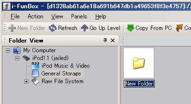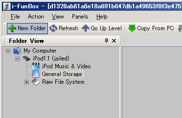 ツリーには、「iPod Music & Video」、「General Storage」、「Raw File System」の三つのフォルダがある。