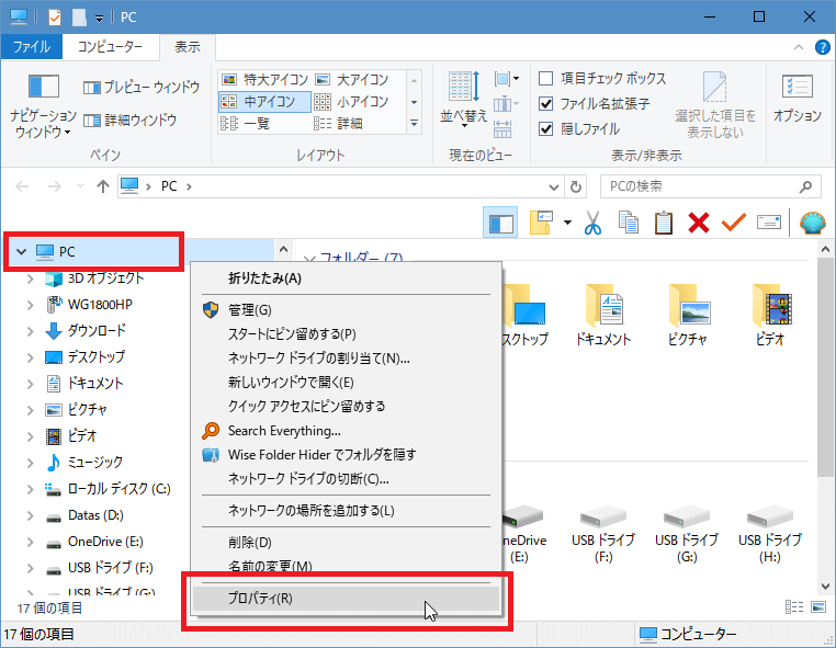 まずエクスプローラーを開いて[PC]アイコンを右クリックし、[プロパティ]をクリックします。