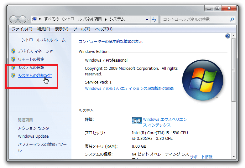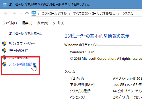 [システム]画面が表示されるので、[システムの詳細設定]をクリックします。