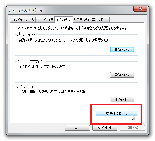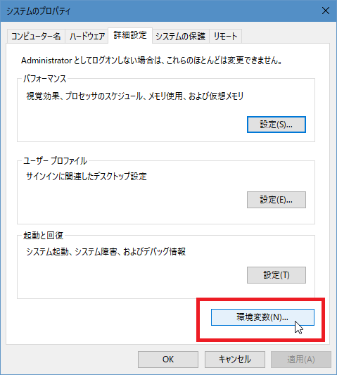 [システムのプロパティ]画面が開くので、[詳細設定]タブをクリックし[環境変数]ボタンをクリックします。