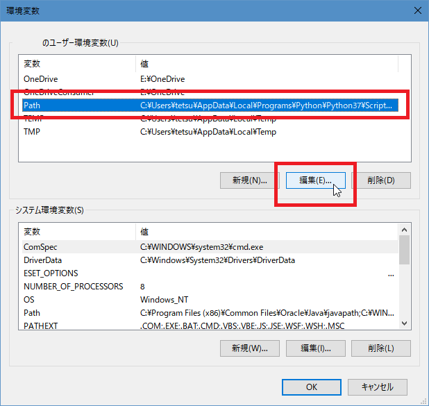 [環境変数]画面で[Path]を選択し、[編集]をクリックします。