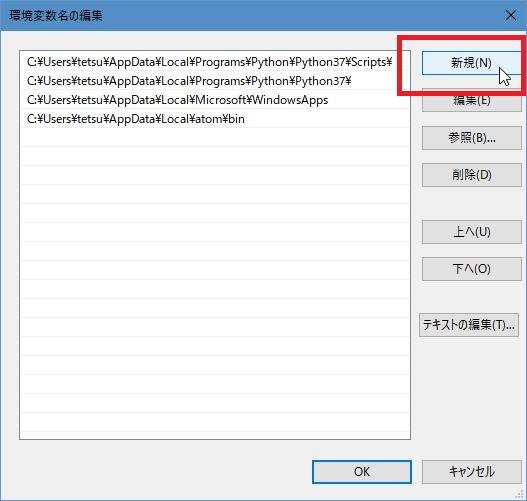 [環境変数名の編集]画面が表示されるので、[新規]ボタンをクリックします。