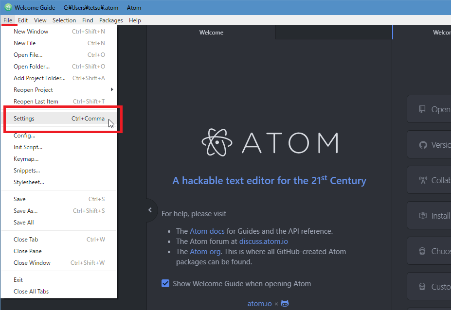 ATOMのメニューから[File] > [Settings]をクリックします。