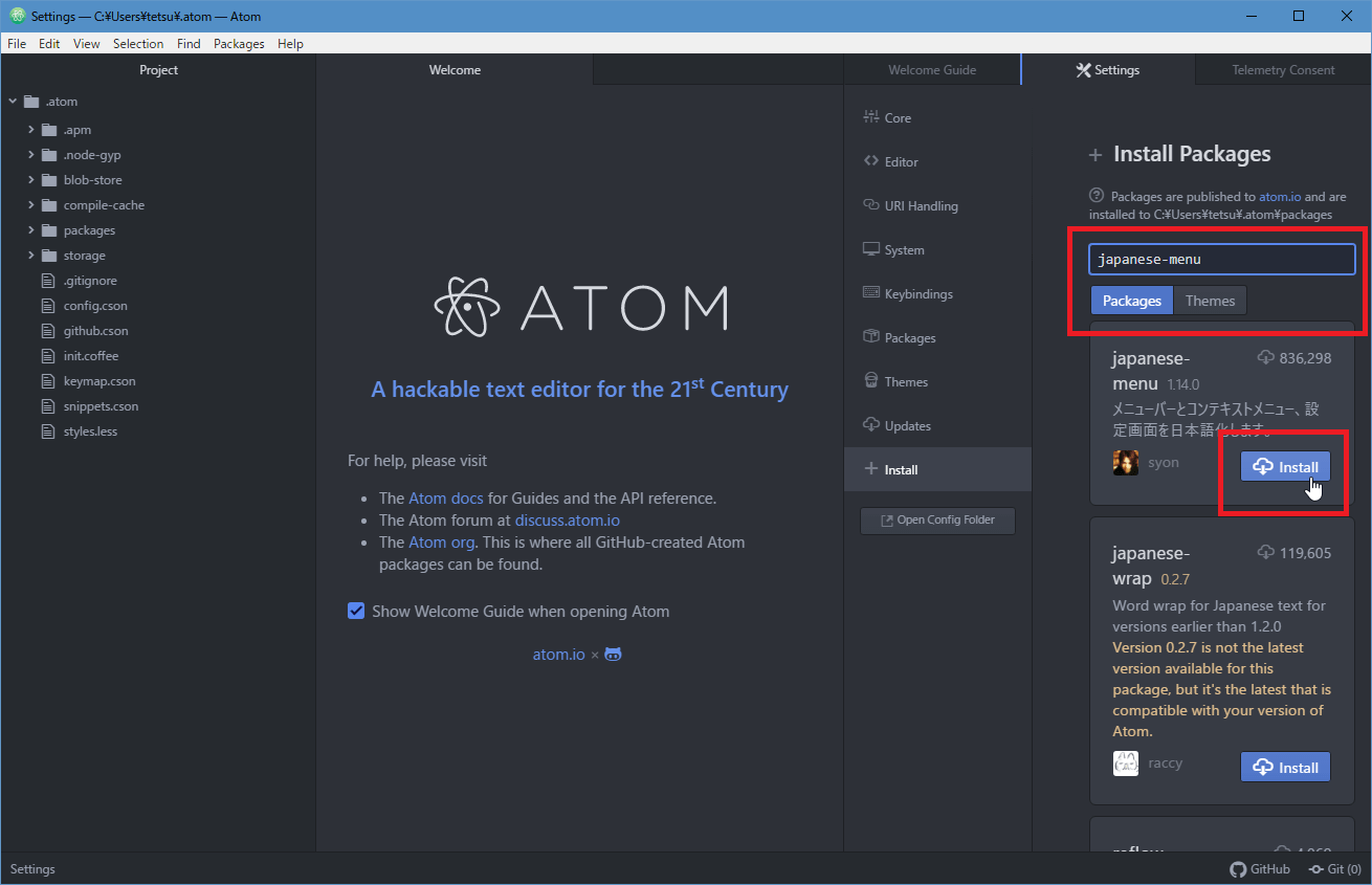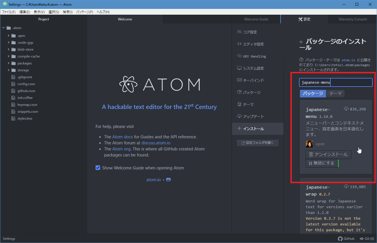 ATOMを日本語化するためには、「japanese-menu」というパッケージをインストールします。