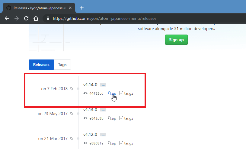 いくつかのバージョンのダウンロードリンクがありますが、とりあえず現在の最新版と思われる v1.14.0 の "zip" をクリックして日本語化パッケージをダウンロードします。