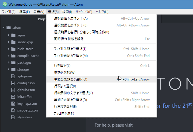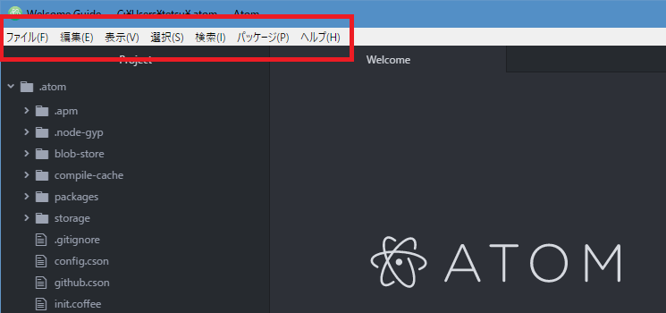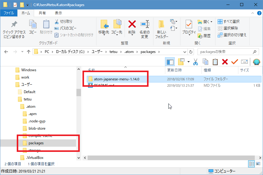 解凍するとフォルダ「atom-japanese-menu-1.14.0」が作成されるのでそのフォルダを"C:\Users\ユーザー名\.atom\packages"フォルダに移動します。
