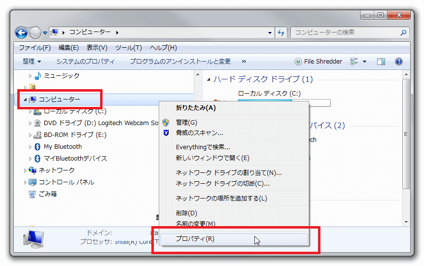 まずエクスプローラーを開いて[マイコンピューター]アイコンを右クリックし、[プロパティ]をクリックします。