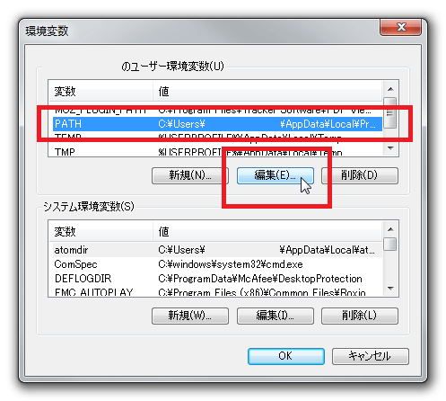 [環境変数]画面が表示されるので、変数リストから"PATH"を選択し、[編集]ボタンをクリックします。