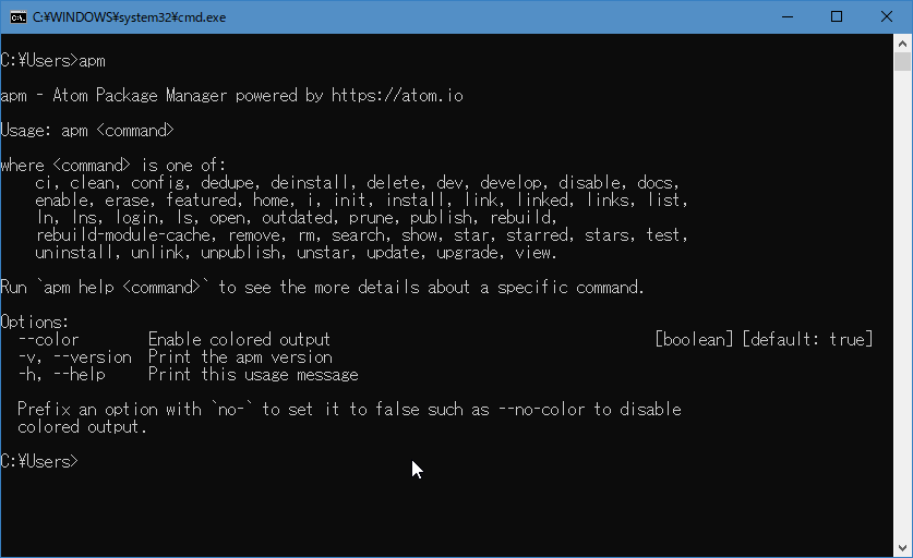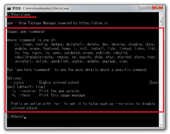 以下の画面のようにapmコマンドのヘルプが表示されればOKです。