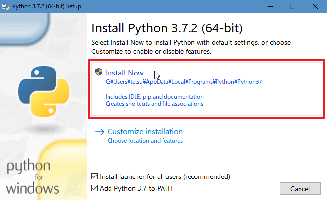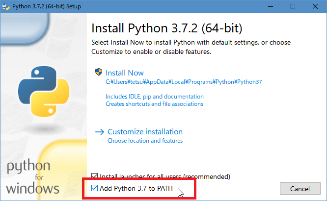 pythonのインストーラーが起動するので、[Add Python 3.7 to PATH]のチェックをオンにします。
