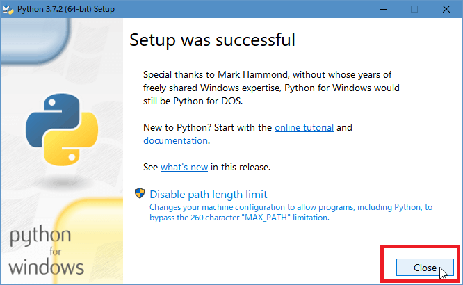 インストールが正常に終了すると、「Setup was successful」と表示された画面に変わるので[Close]をクリックします。