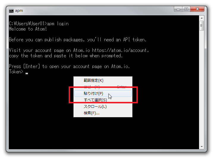 "API token"をコピーしたらコマンドプロンプトに戻って右クリックして[貼り付け]をクリックします。