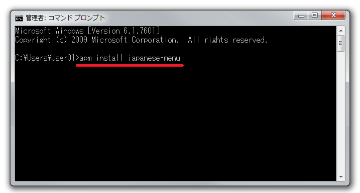 例えば、日本語化パッケージの"japanese-menu"をインストールしたければ以下のようになります。