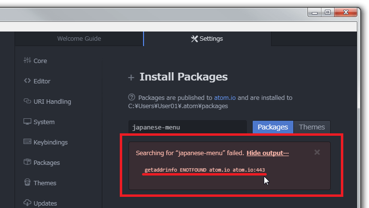ATOMのInstall Package画面でパッケージ名を入れてインストールしようとすると、以下のメッセージが表示されてインストールができない場合があります。