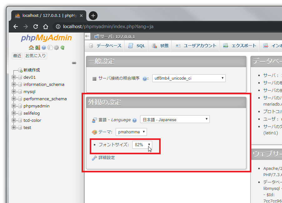 phpMyAdminの画面の全体的なフォントサイズの調整は、ホーム画面でフォント倍率が指定できるのでそこで調整もできますが、単純な画面倍率の変更なのですべてが変わっていまいます。