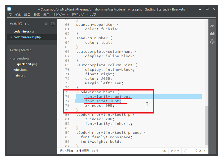 "codemirror.css.php"ファイルの"CodeMirror-hints"セレクタにフォントとフォントサイズを指定するプロパティを追記します。