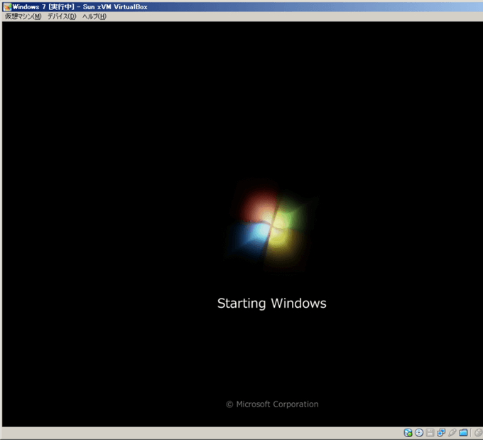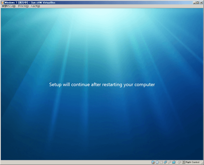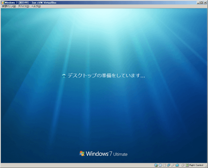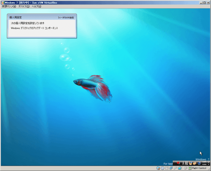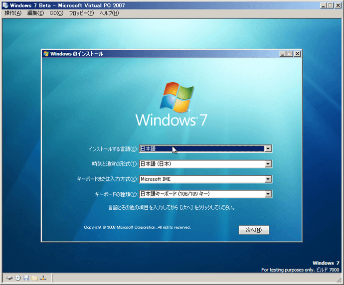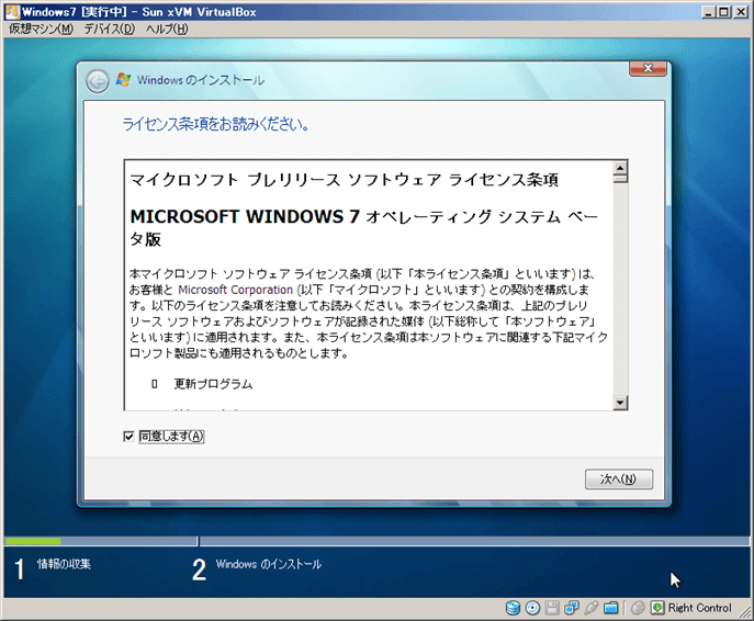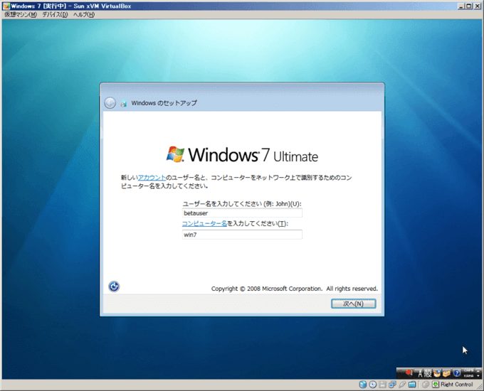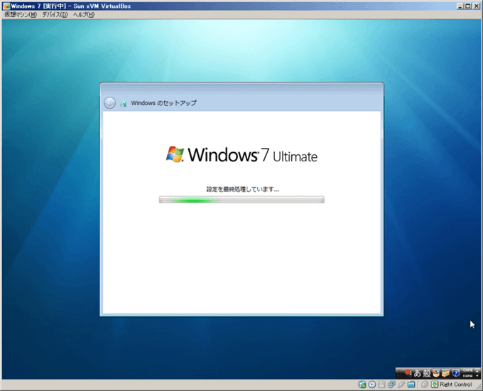Windows 7 日本語ベータ版をメモリ512MB、仮想HD用量20GBに設定されたVirtualBoxにセットアップした。