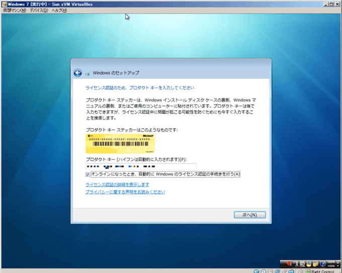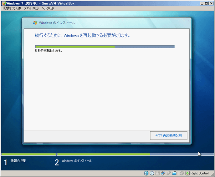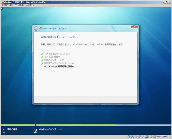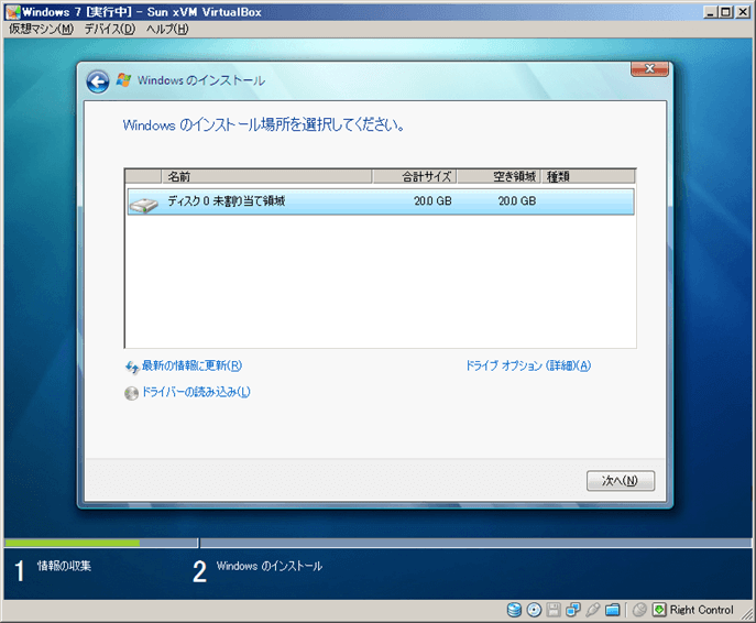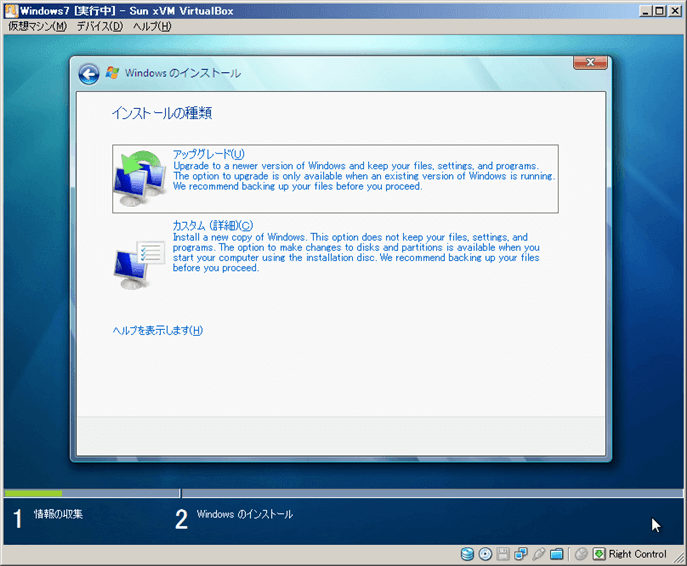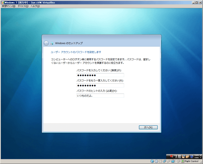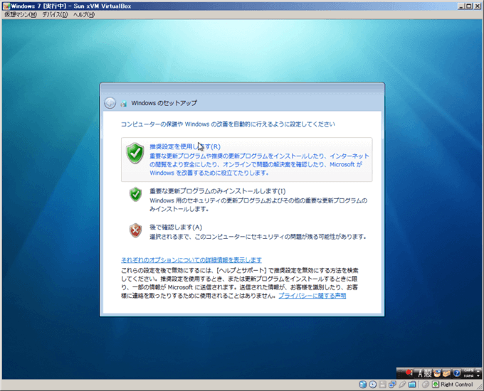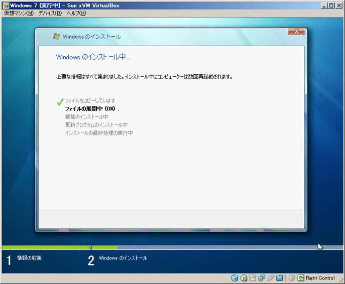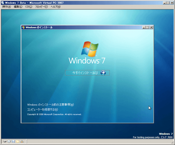 Windows 7 日本語ベータ版をメモリ512MB、仮想HD用量20GBに設定されたVirtualBoxにセットアップした。