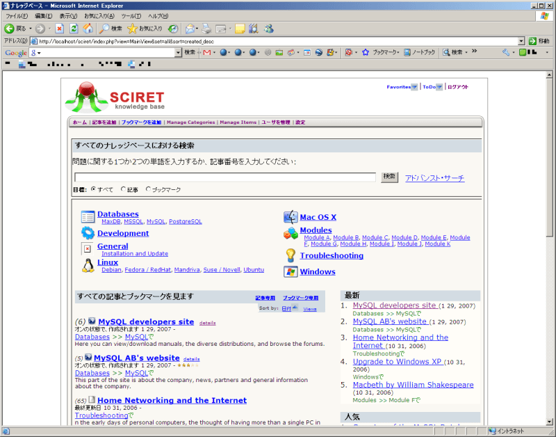 WIMP(Windows、IIS、MySQL、PHP)環境にセットアップできるオープンソース ナレッジベース(Knowledge Base) システム「SCIRET」を覚書。