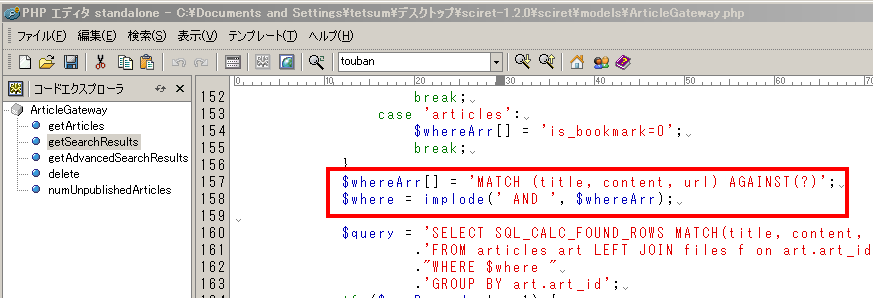 開いたらgetSearchResults関数のMATCHを使ったWhere句を作成しているコード部分(157~158行目)を以下のように変更する。