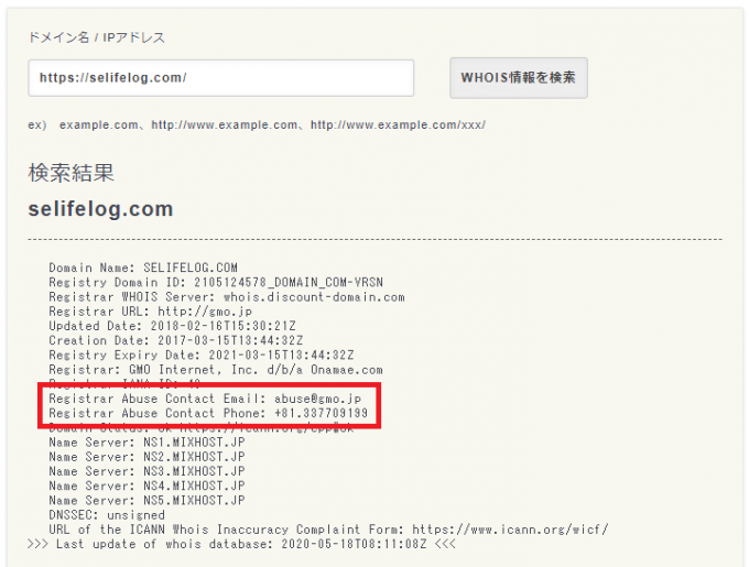 以下は、このサイトを「Whois検索」で検索した結果の例です。