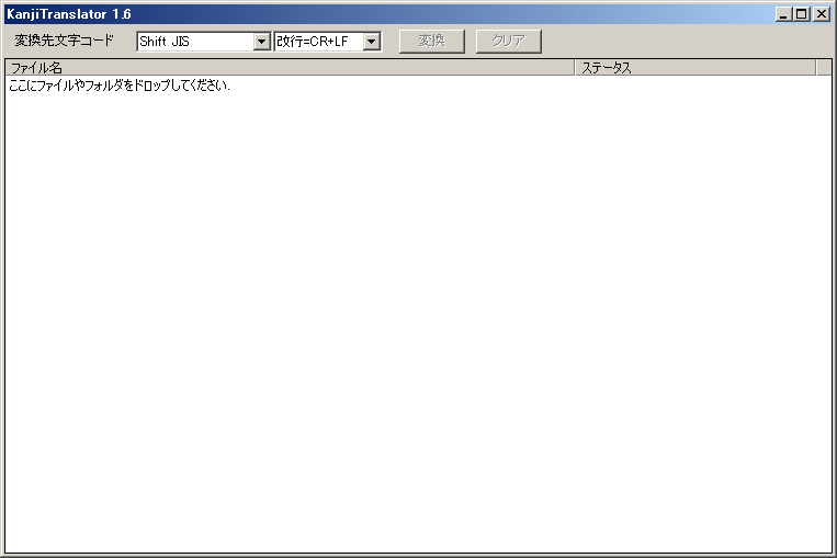 操作も簡単で、変換したいファイルを「KanjiTranslator」のウィンドウにドラッグ&ドロップして、変換したい文字コードを選択して[変換]ボタンをクリックするだけ。