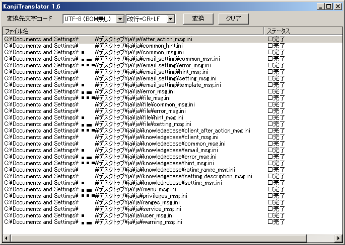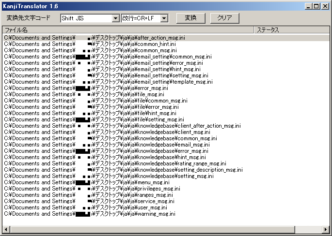 「KanjiTranslator」を起動して抽出した"ini"ファイルを全て選択して「KanjiTranslator」にドラッグ&ドロップする。