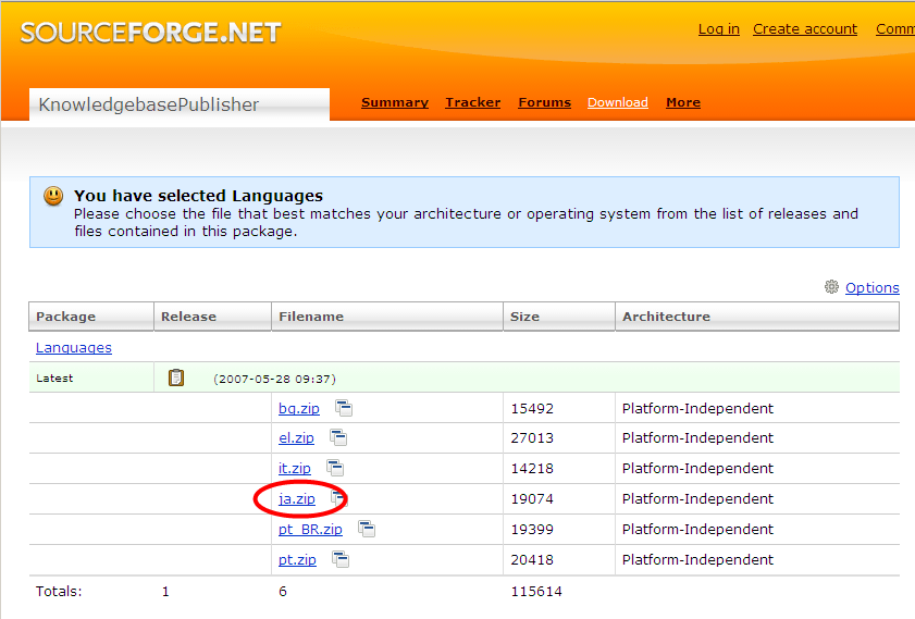 以下のサイトから「KBPublisher」の言語パック"ja.zip"をダウンロードする。