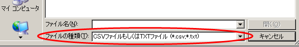 "CSV、TXTファイル(*.csv;*.txt;),*.csv;*.txt,Excelファイル(*.xls;*.xlt),*.xls;*.xlt" _