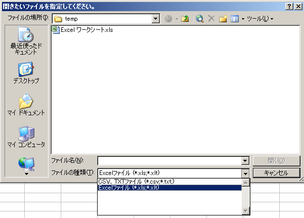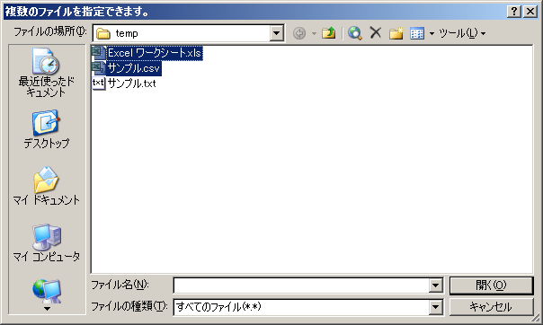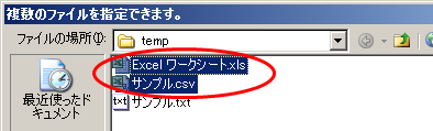 このように指定した場合、[ファイルを開く]ダイアログボックスの[ファイルの種類]コンボボックスの一覧に"CSVファイル"と"Excelファイル"の2つがリストとして表示され、コンボボックスでどちらかを選択できるようになる。