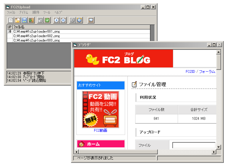 別の画面が表示され、FC2の画面をブラウズして自動的に画像をアップロードし始める。