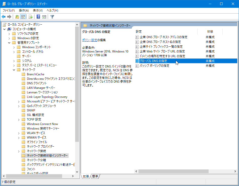 [ローカルグループポリシー エディター]の右画面に表示される[グローバルDNSの指定]をダブルクリックします。