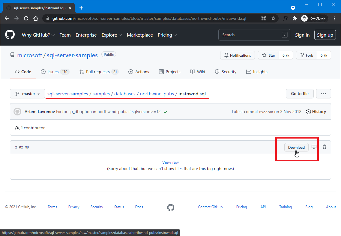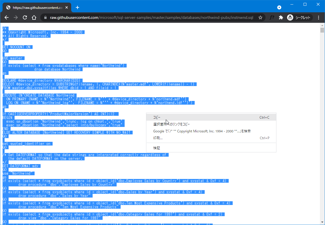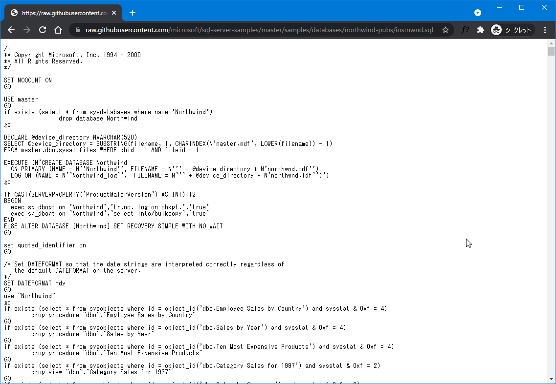 以下のURLを開いてNorthwindデータベースを作成するためのSQLファイルをダウンロードします。