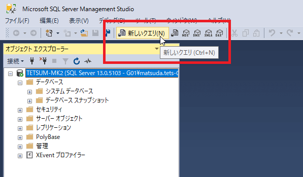 「Microsoft SQL Server Management Studio」を起動して、ツールバーから[新しいクエリ]をクリックします。