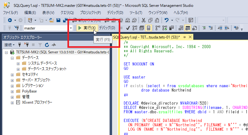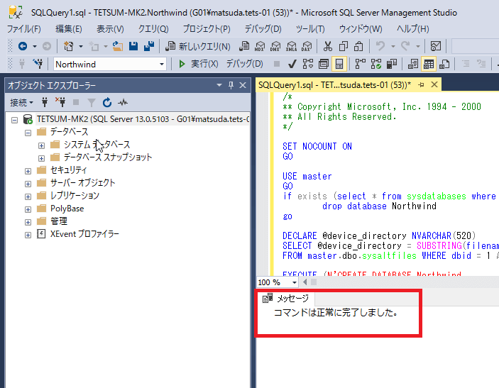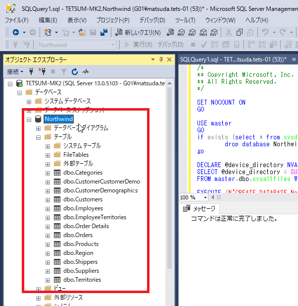 画面左の「オブジェクト エクスプローラー」でデータベースを開くと「Northwind」データベースが作成されていることが確認できます。
