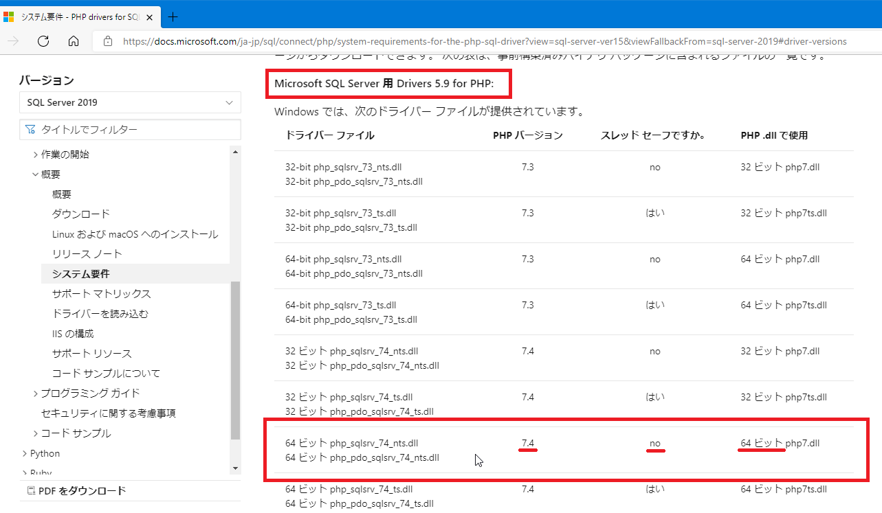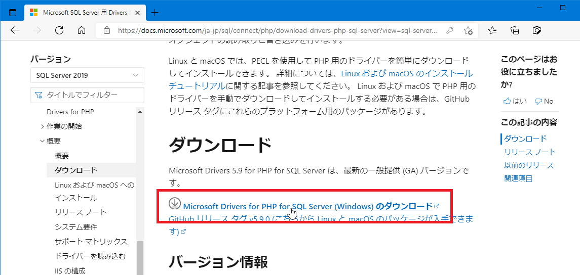 ダウンロードした「SQLSRV59.EXE」は、「Microsoft SQL Server 用 Drivers 5.9 for PHP」なので、このページの「ドライバーバージョン」で「Microsoft SQL Server 用 Drivers 5.9 for PHP」の表を見ます。