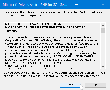 ダウンロードした「SQLSRV59.EXE」(2021/10/20時点での最新版)をダブルクリック、[使用許諾契約]画面が表示されるので[Yes]をクリックします。