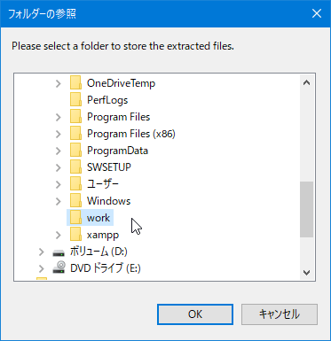 解凍先のフォルダを指定する画面にもどるので[OK]をクリック、解凍します。