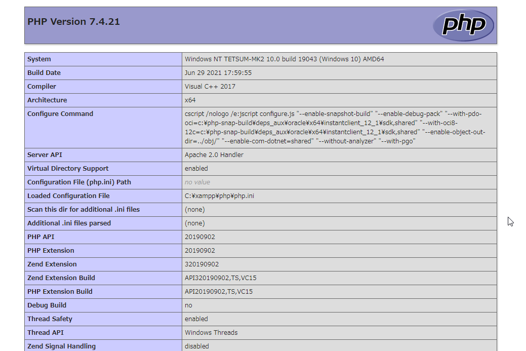 phpinfoの結果が表示されたら以下の情報を確認してください。